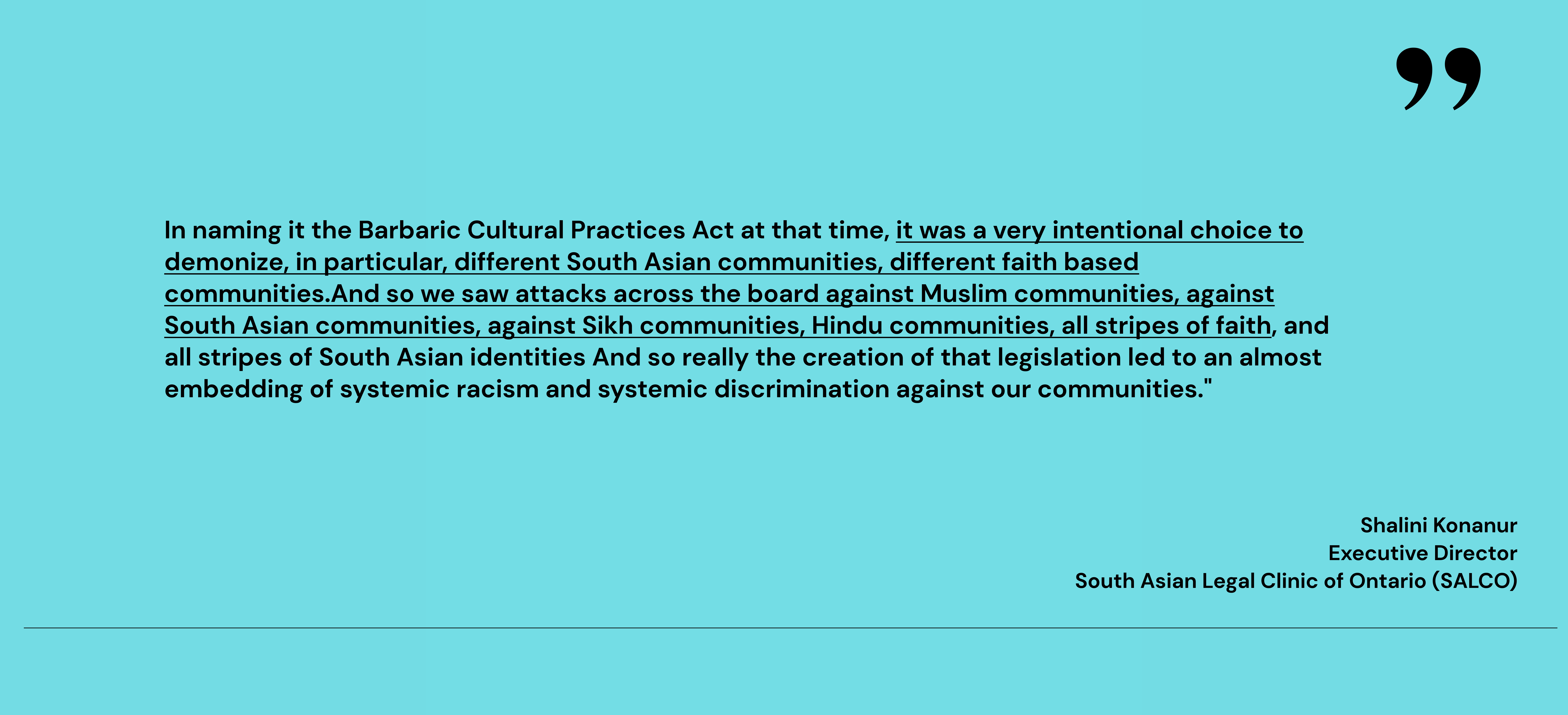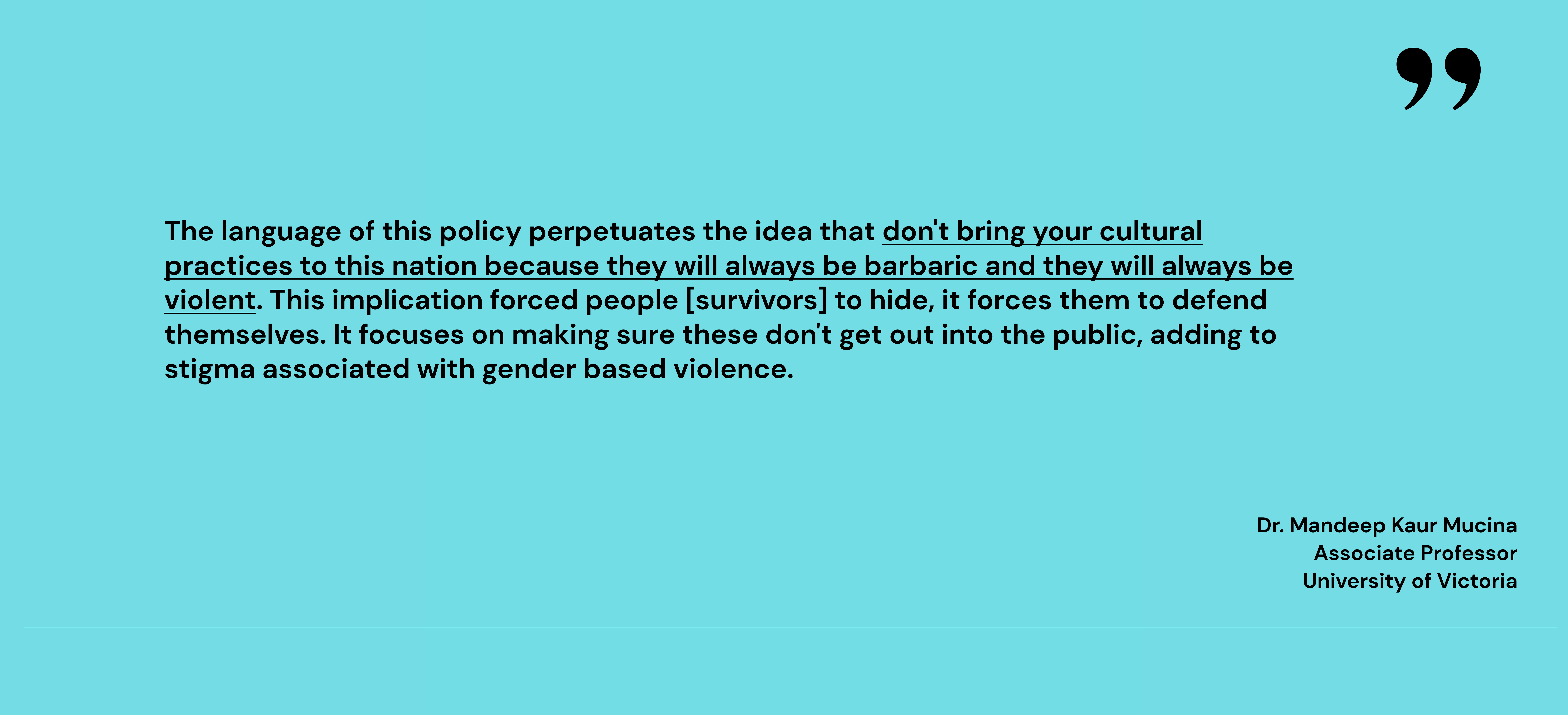 The impact of the problematic terminology used in the original Bill, and the changes it brought in the legal structure, still continue to negatively impact racialized survivors of gender based violence. As Deepa Mattoo, lawyer, activist and Executice Director of the Barbra Schlifer Commemorative Clinic that supports survivors of gender based violence narrates, “While originally touted as an opportunity to enhance protection for girls and women against the “foreign” horrors of polygamy, early and forced marriage, and “honor”-based killings, [Bill S-7] instead fanned the flames of xenophobia on a mass level, failed to protect women, and, created a higher risk of harms for women who are victims of gender- or family-based violence”.